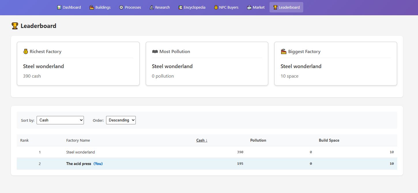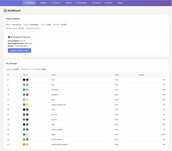 Gameplay: Players build their account over weeks and months (slow game!). The core mechanic is converting input materials into output materials through processes, that live in buildings. Build buildings, install processes, chain them together! Then use the proceeds to research new processes. The key feature is a large portfolio of processes and materials, allowing for custom networks of process chains to produce the material you want.