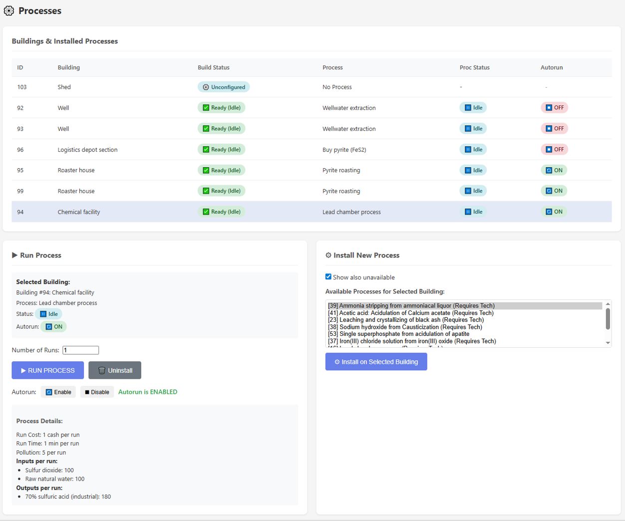 Screenshot 2: Processes page of an account configured for sulfuric acid production.