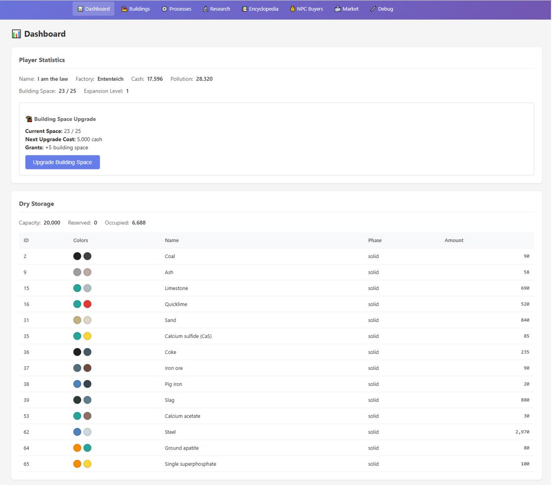 ... is a hobby project for a 2000s-style browsergame about building up the chemical industry through the 20th century and beyond. The goal is a detailed representation of industrial processes from the early industrialization to the modern economy, tracking intermediate materials, by-products and so on, all in a browser window.